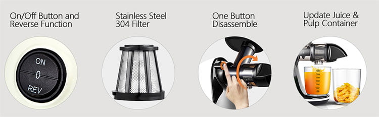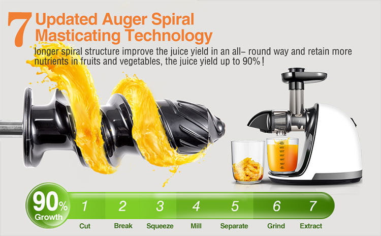 Slow Juicer produces high quality fruit or vegetable uices based on a method that minimizes the effects of oxygen and het and efectively preserves thenutrients, colors and flavors of the ingredients.